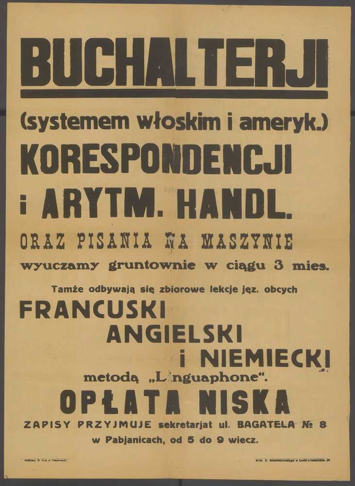 Buchalterji (systemem włoskim i ameryk.), korespondencji i arytm. handl. oraz pisania na maszynie wyuczamy gruntownie w ciągu 3 mies. [...]