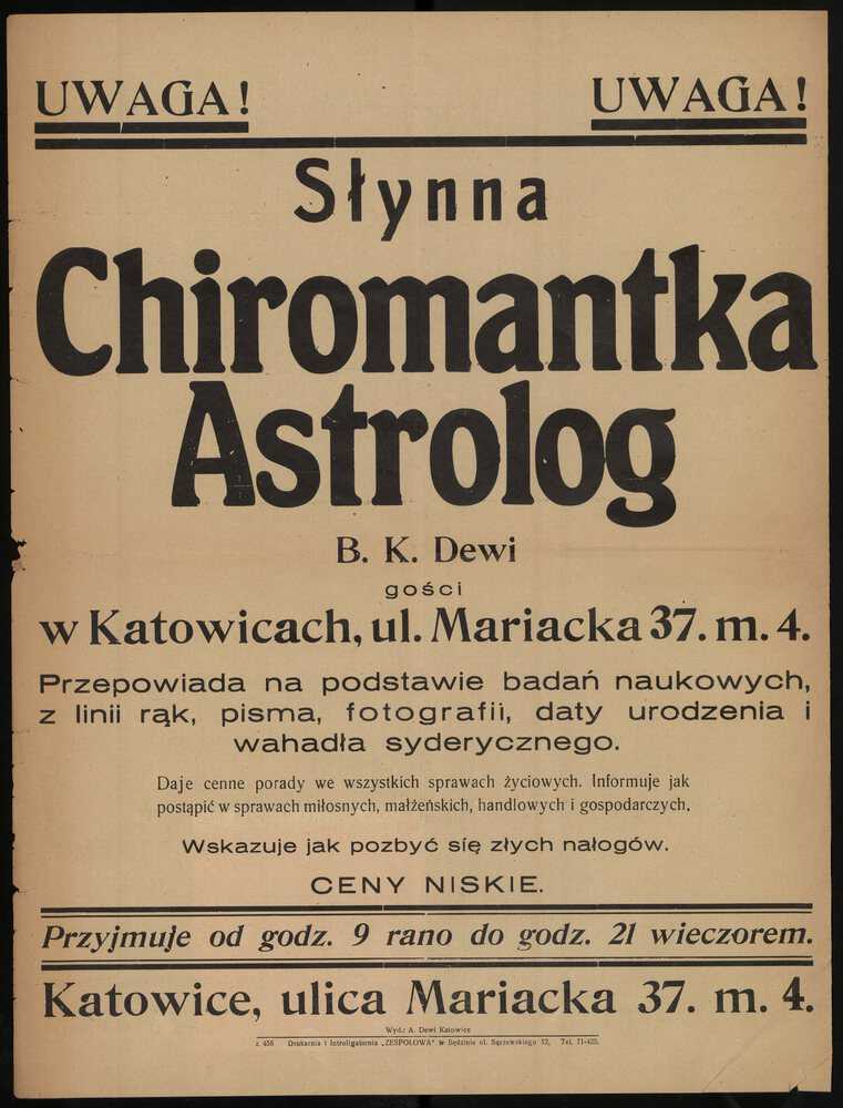 Uwaga! Słynna chiromantka astrolog B.K. Dewi gości w Katowicach, ul. Mariacka 37 m. 4. Przepowiada na podstawie badań naukowych, z linii rąk, pisma, fotografii, daty urodzenia i wahadła syderycznego [...]